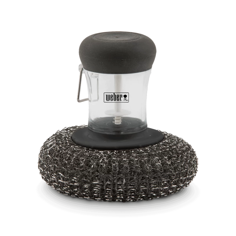 Vul het handvat met reinigingsmiddel, leg de spons op de bakplaat en duw licht op het handvat zodat er wat zeep uitkomt.