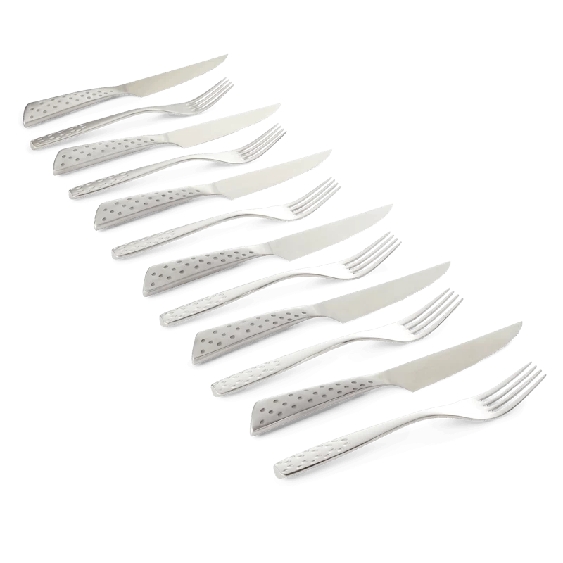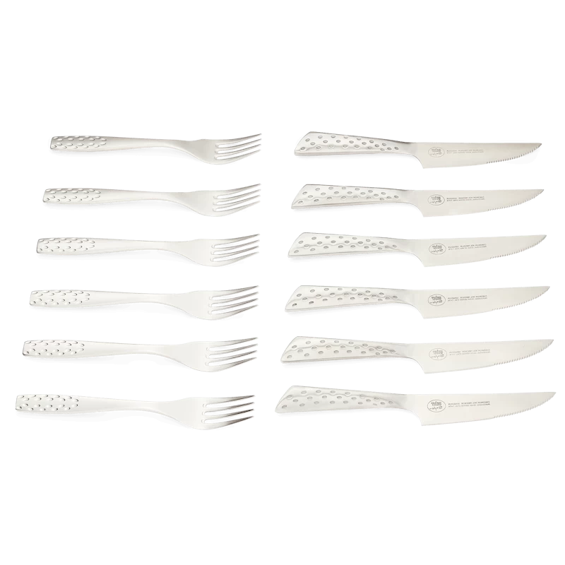 Of het nu gaat om een spontane barbecue of een romantisch diner, details maken het verschil. De zes roestvrijstalen vorken geven je de best mogelijke ergonomische grip en de scherpe tanden van het mes snijden elk vlees met gemak. Maak uw tafel compleet met kracht en stijl.