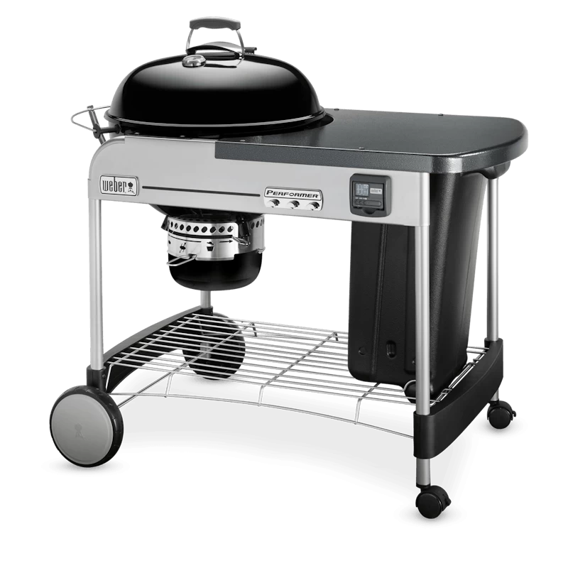 Het handige ontwerp met open onderstel en onderrooster van de Performer Premium GBS biedt ruim voldoende opslagruimte voor dienbladen, grillpannen, barbecuewanten en reservespatels. Met de ingebouwde, afneembare, verlichte LCD-kookwekker zult u uw voedsel nooit vergeten. Dankzij de afwerking met twee grote wielen die alle weersomstandigheden aankunnen en twee vergrendelbare zwenkwielen, kunt u uw barbecue met gemak over uw terras verplaatsen – en voorkomen dat hij halverwege het barbecueën wegrolt. De ketel en deksel van de Performer Premium GBS Houtskoolbarbecue worden geleverd met 10 jaar beperkte garantie: ze zullen gegarandeerd niet doorroesten of -branden.